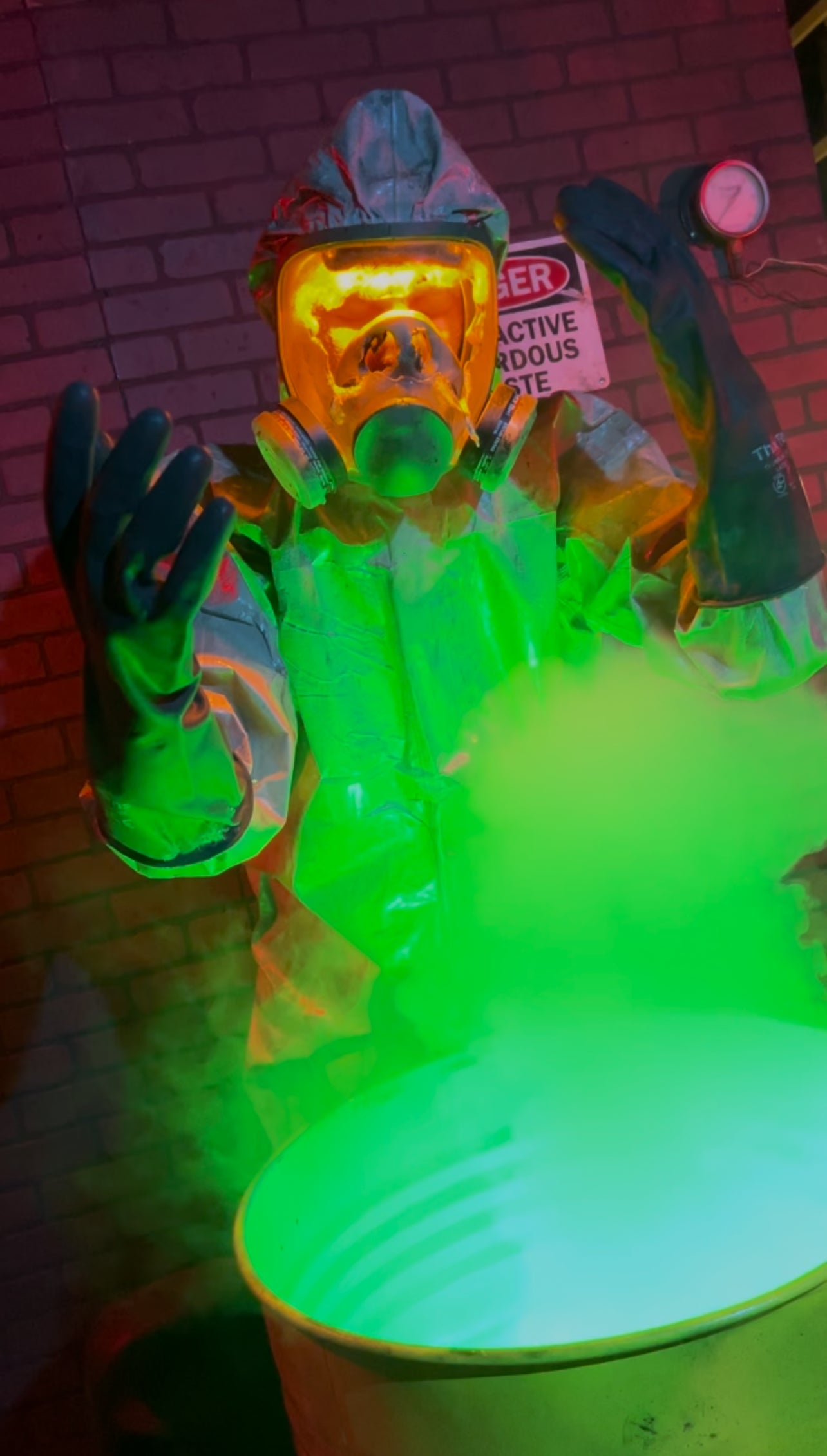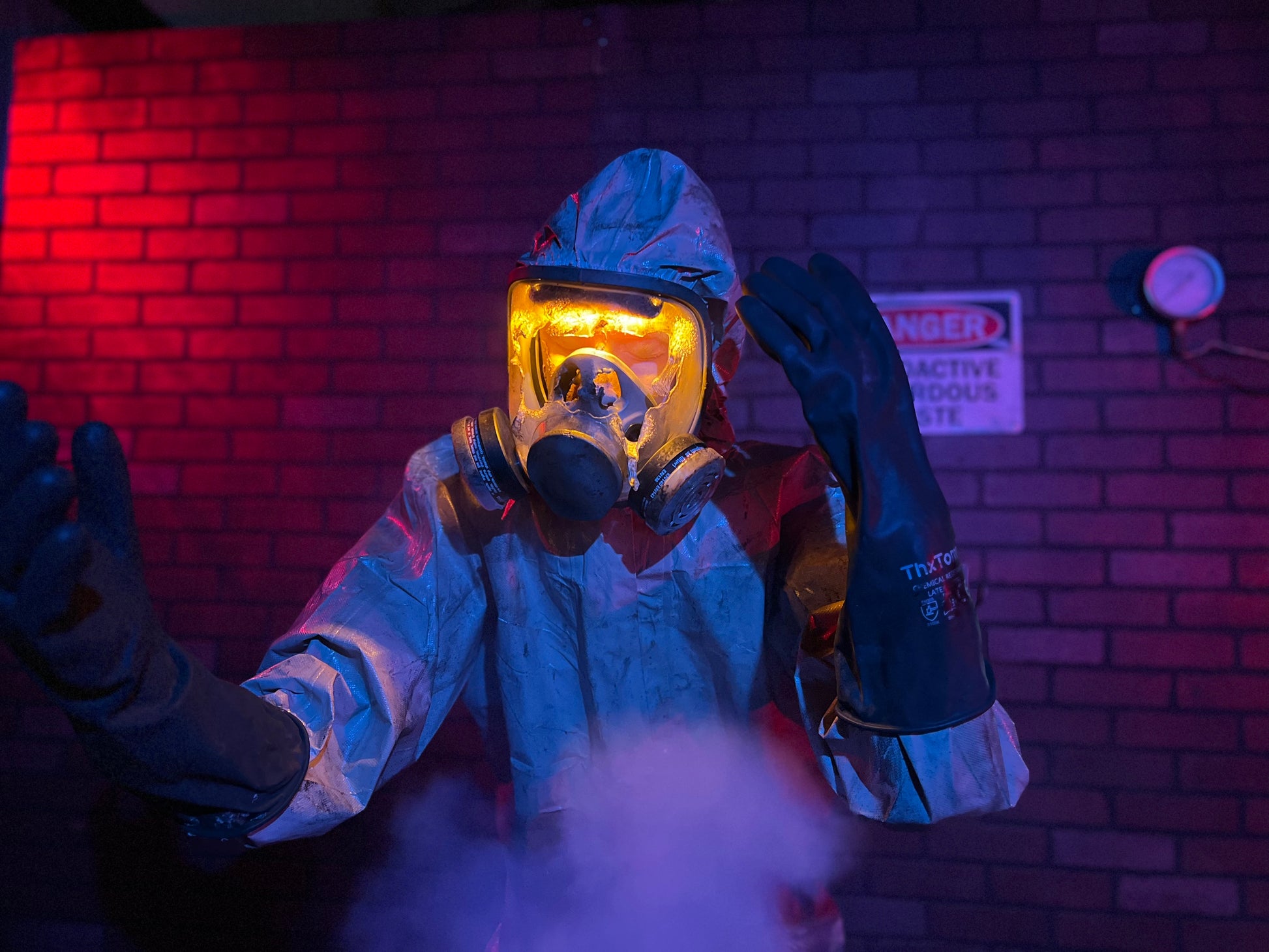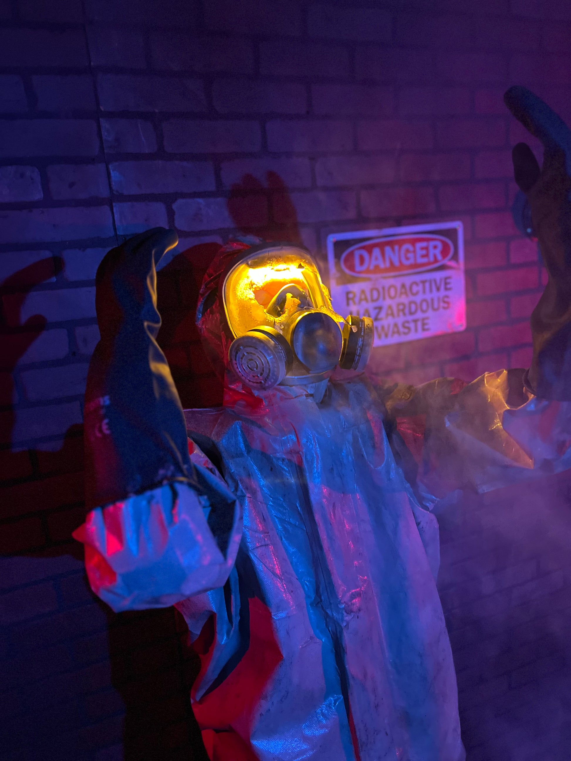 This unlucky lab worker was simply in the wrong place at the wrong time. When activated, the barrel shoots a blast of acid (fog) up towards him, as he leans back and grabs at his chemically burned face. An extensive range of movement, various fog/light effects, and powerful sound deliver a spine chilling performance that will surely grab everyone’s attention.