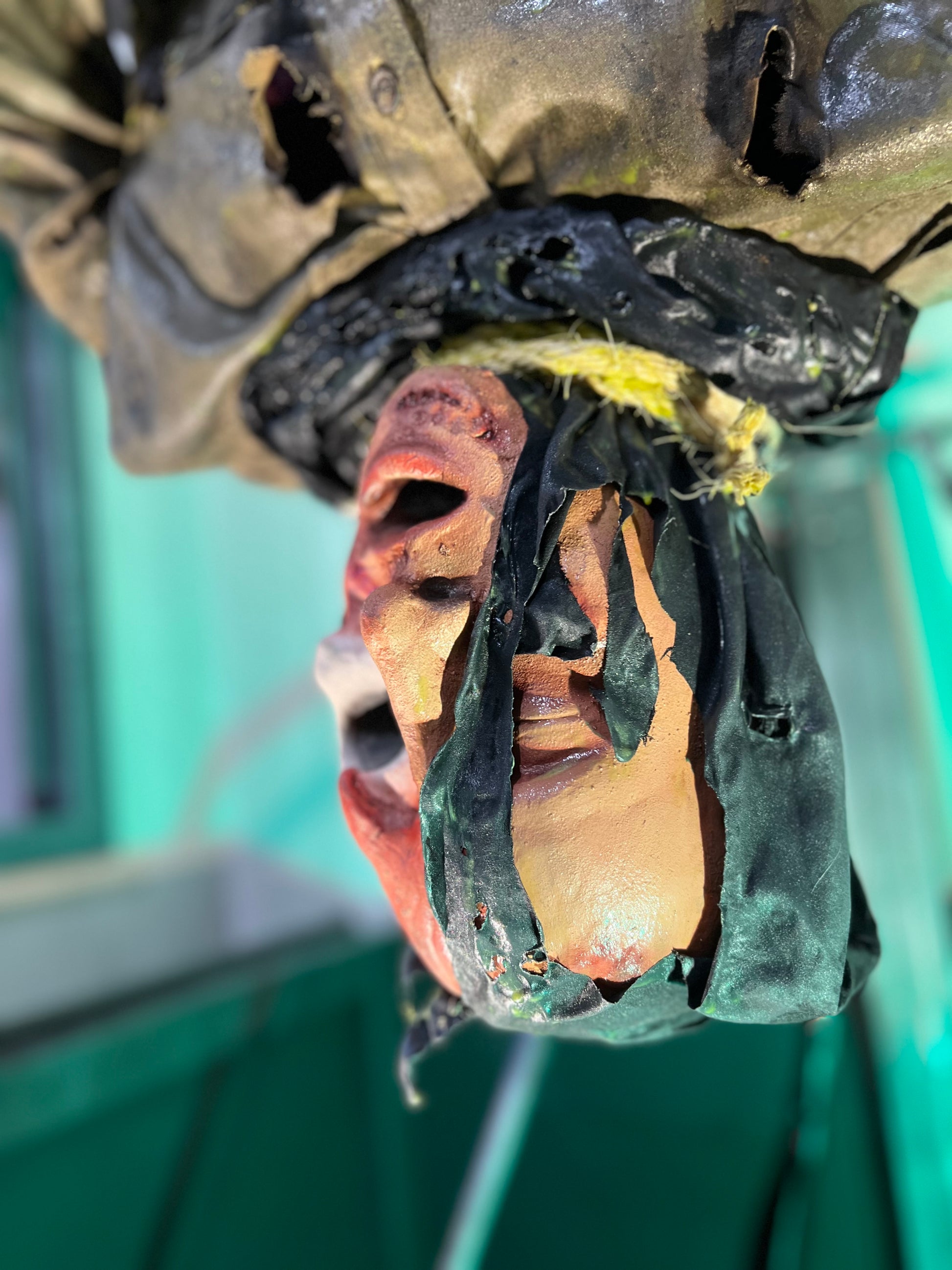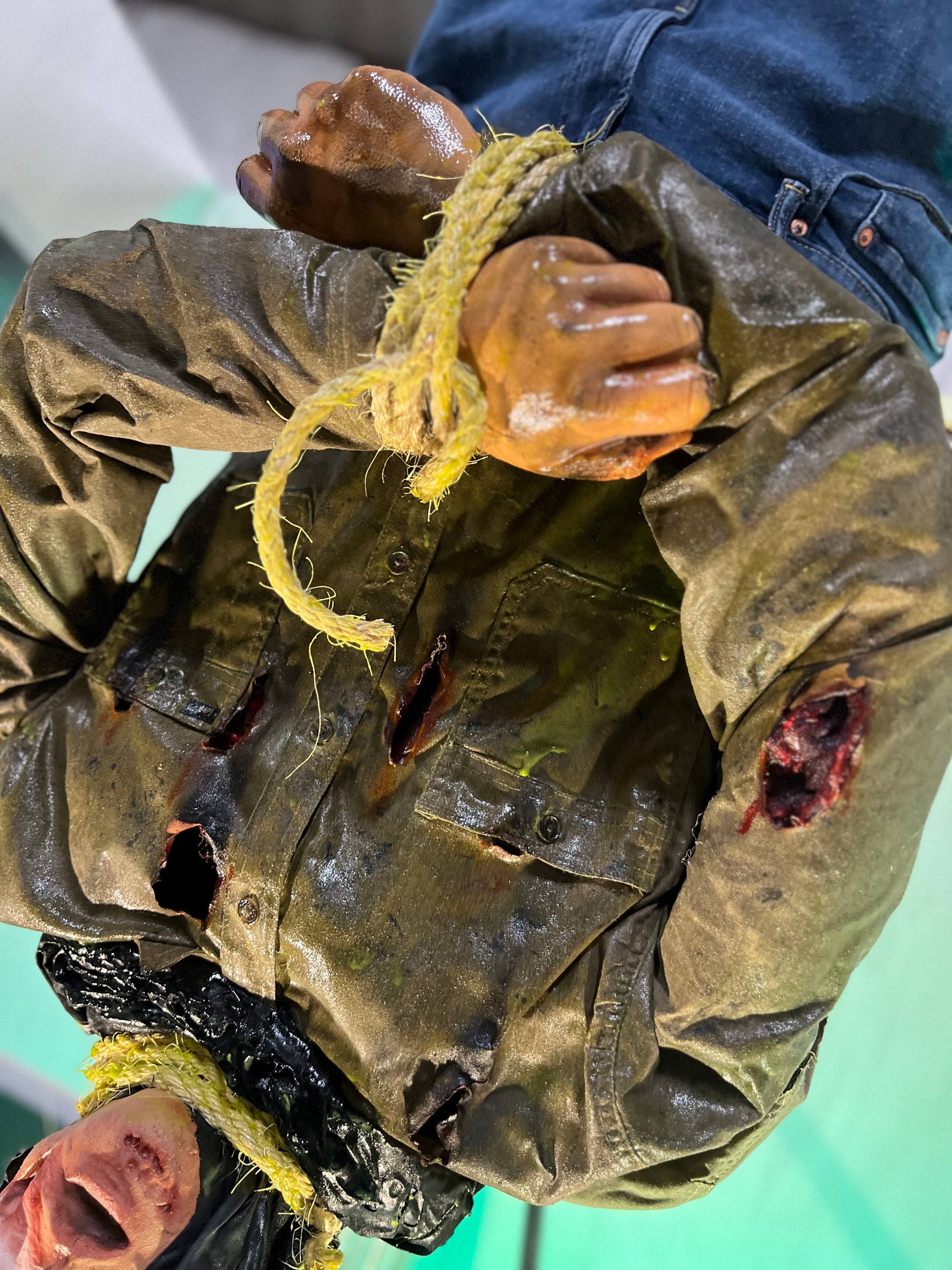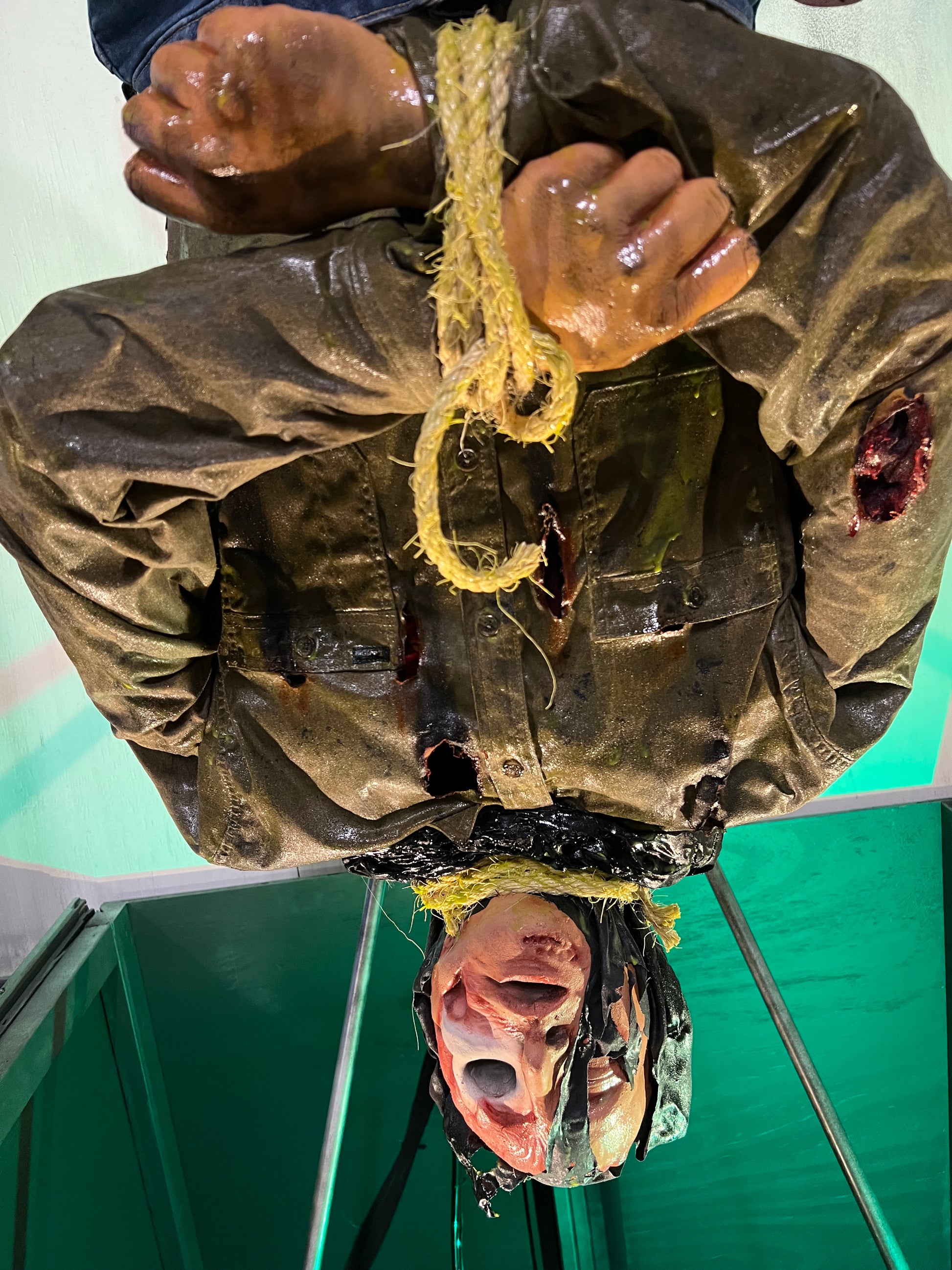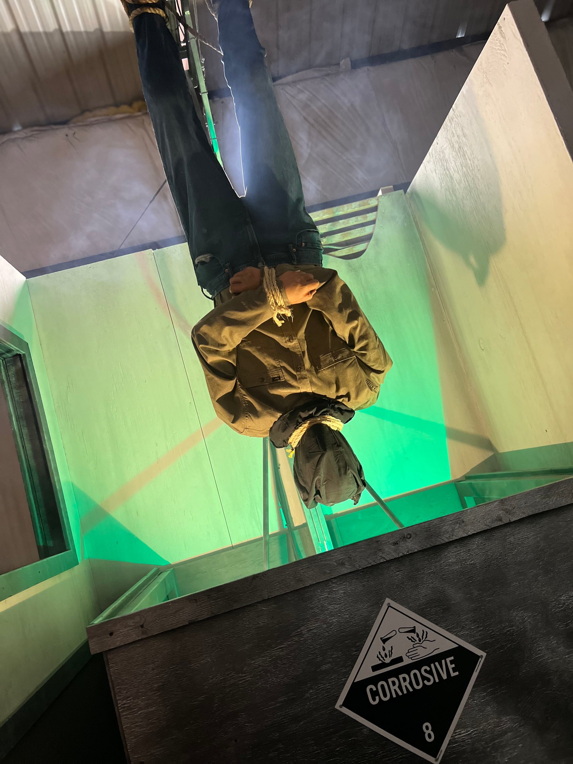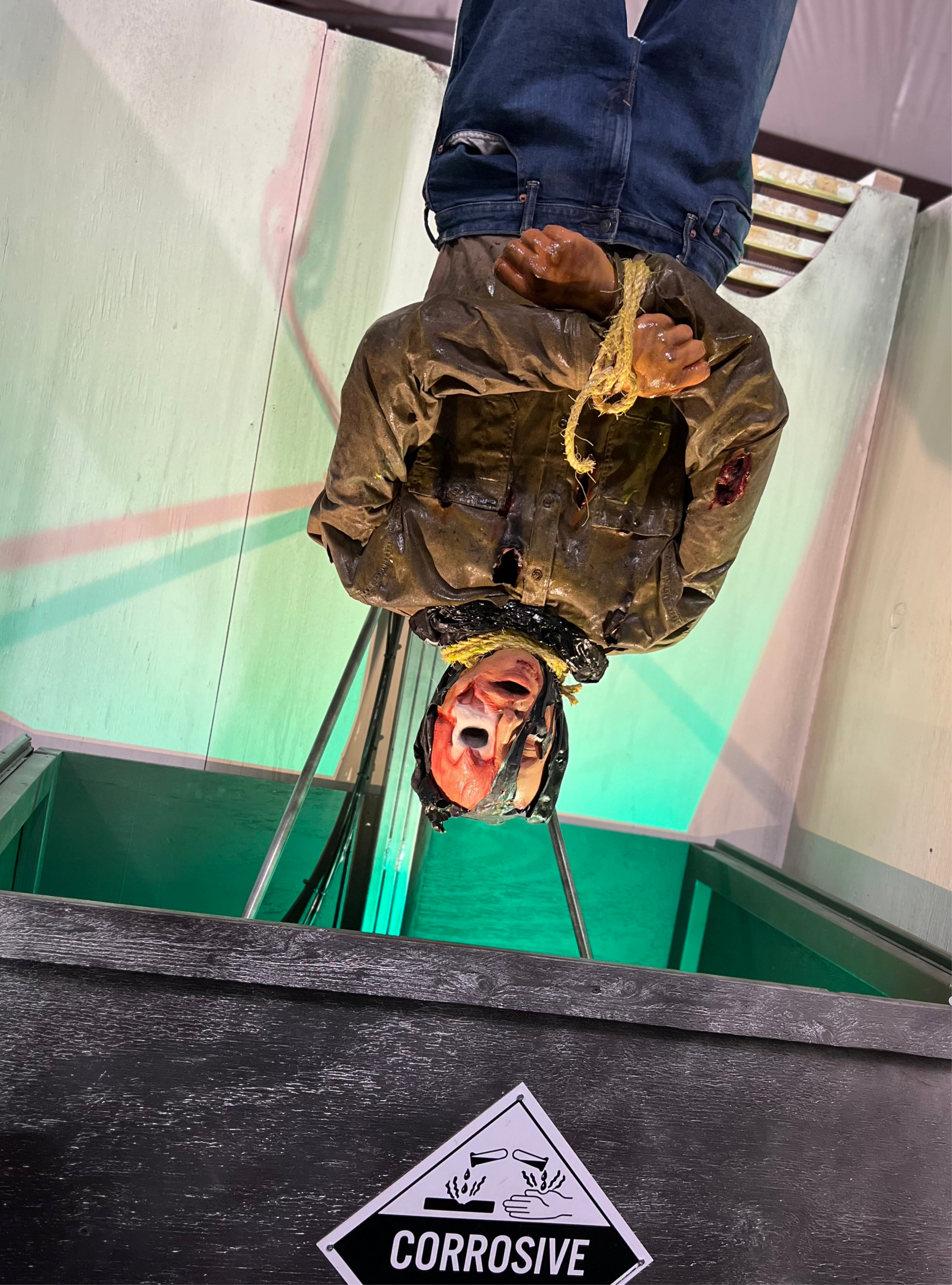This piece includes: animatronic character, 11.5' tall dropping rig, acid vat, fog machine, lighting, controller, and sound system. Requires compressed air and 110v power.